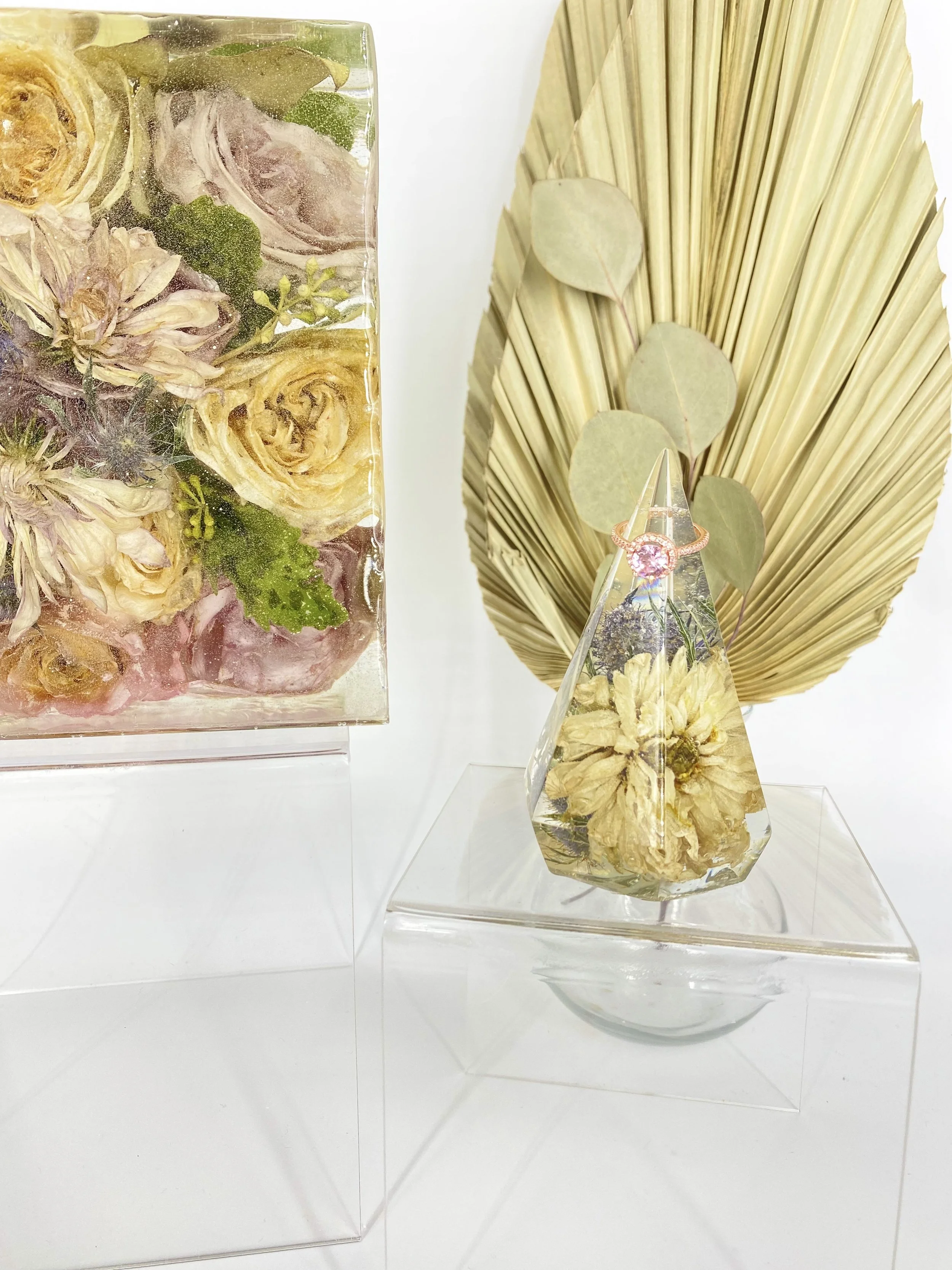 Explore different collections below…see photos of the original bouquet, the drying process, the design and resin processes, and also the final products…the keepsakes you can hold onto forever!