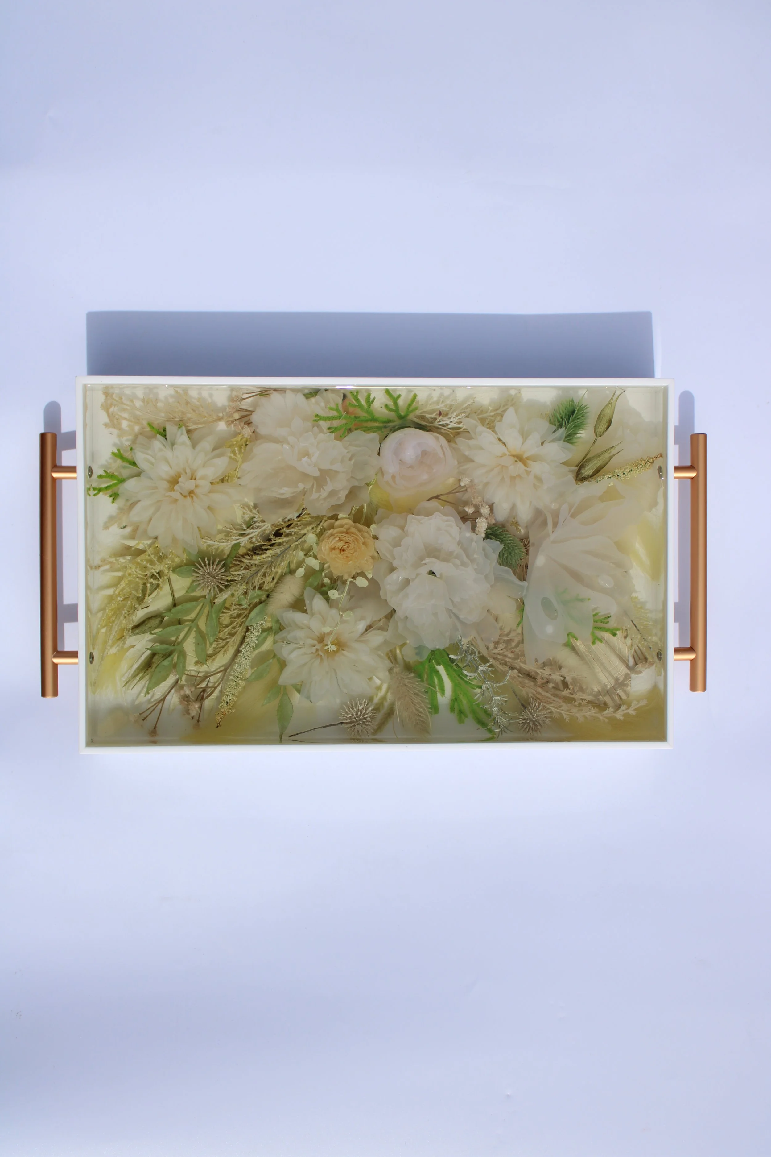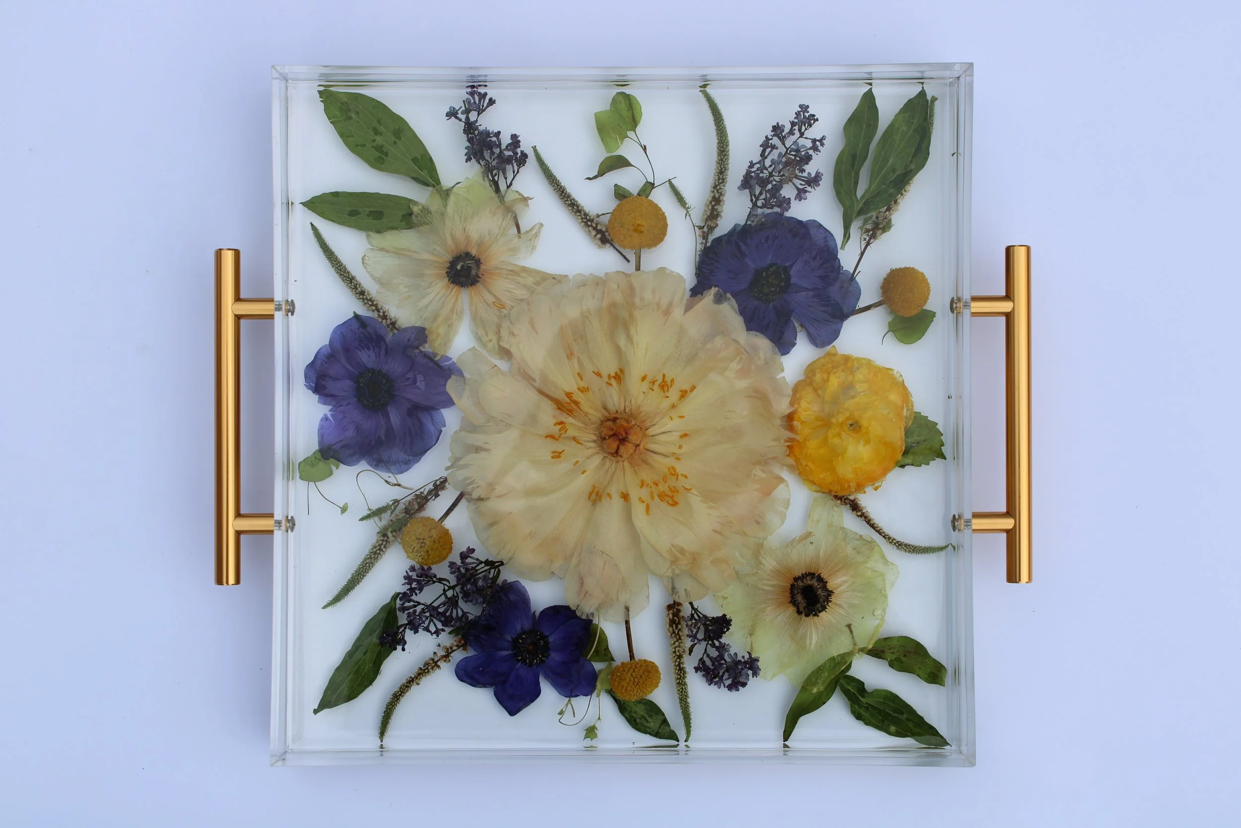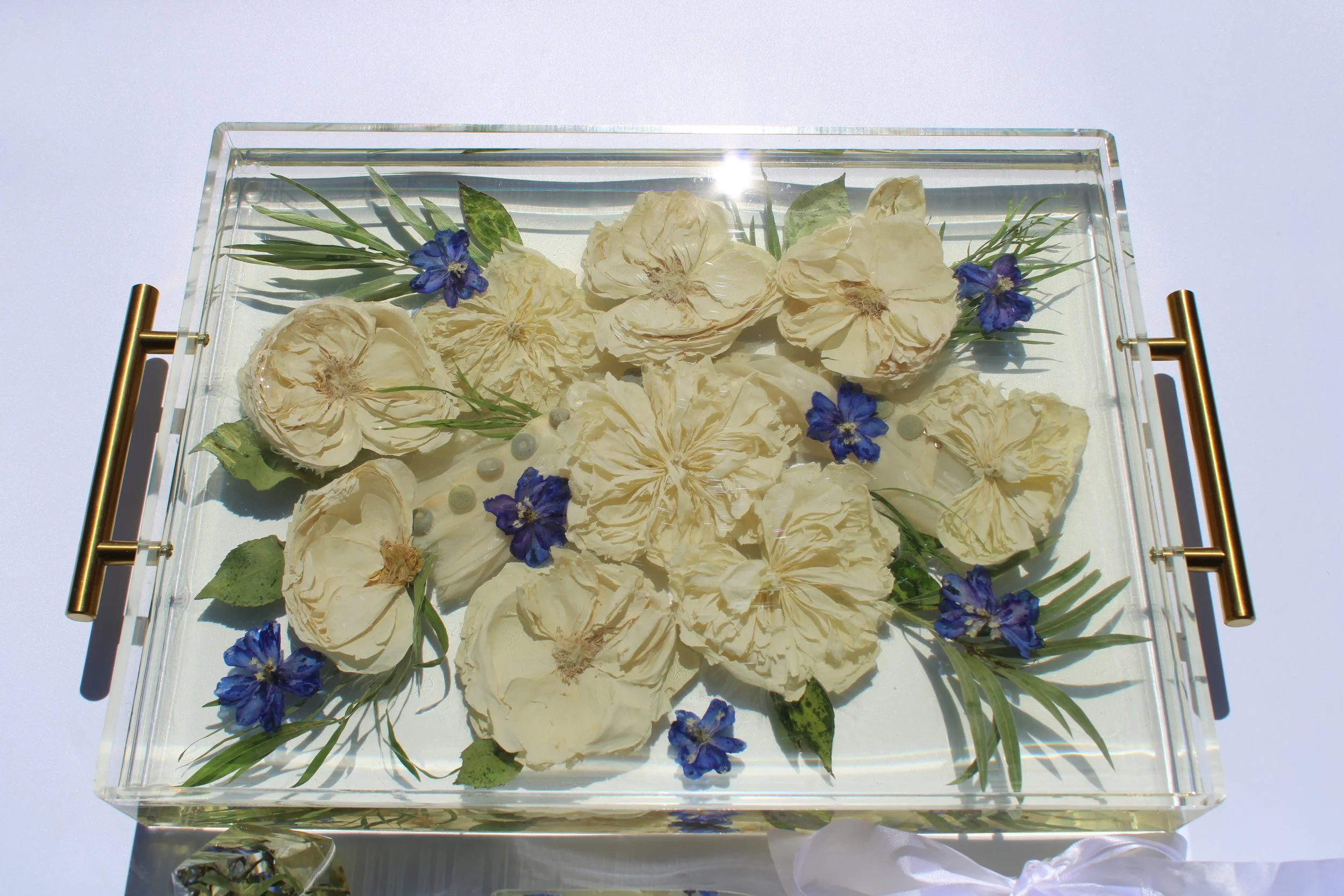 Looking for a unique way to display your flowers? Our custom trays are perfect for showcasing your blooms on a coffee table or ottoman.