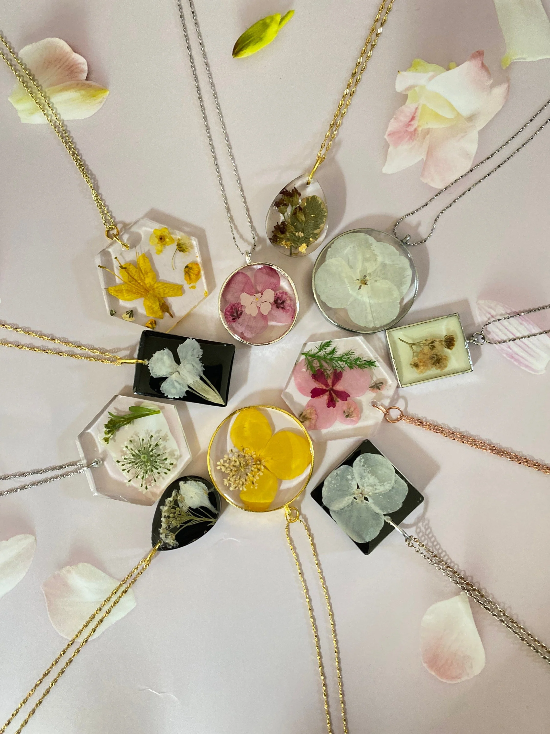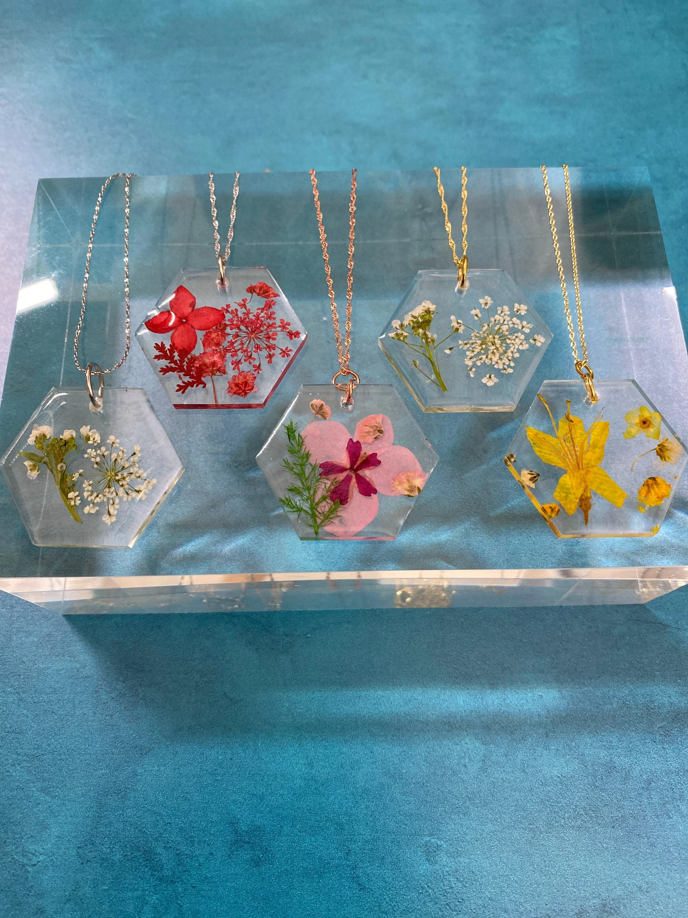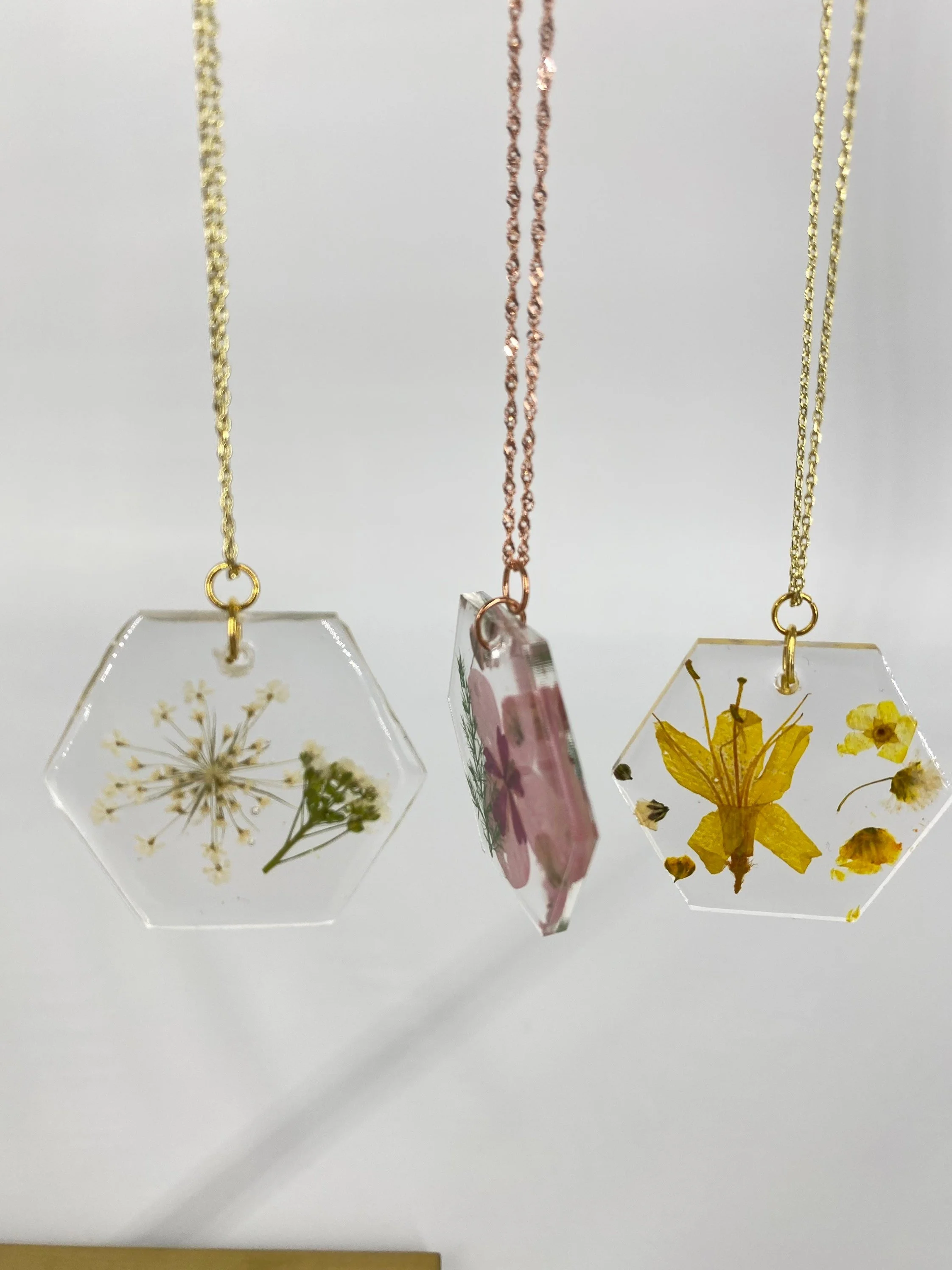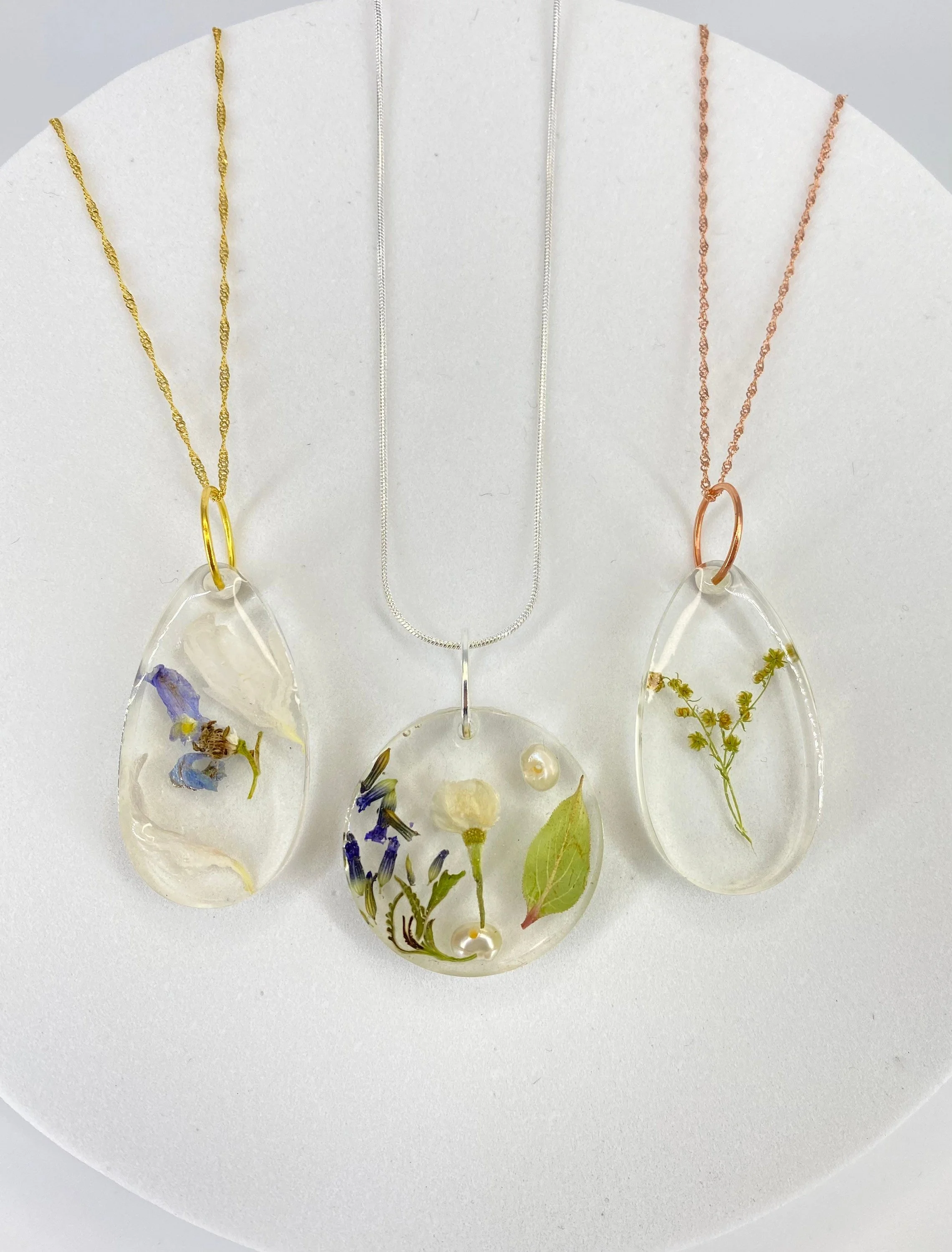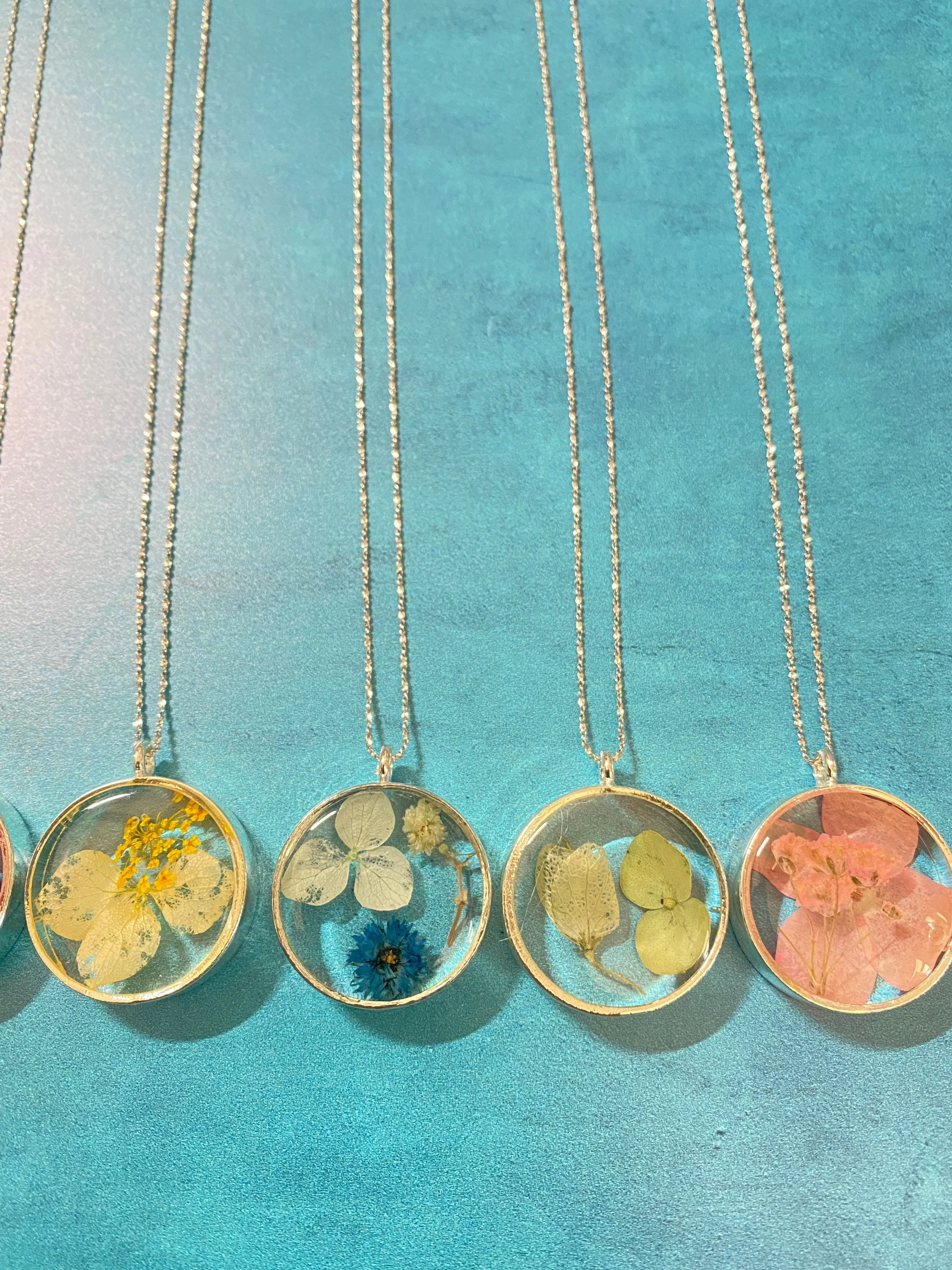 Pendant necklace with real pressed and dried flowers preserved in high-quality resin with gold, silver, or rose gold chain. Perfect for your bridesmaids, mom, mother-in-law, and even for yourself!